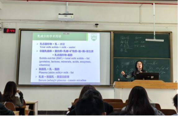 课上,郭教授围绕乳制品行业现状与专业知识,为大家带来了一场内容翔实、深入浅出的专题讲座。她首先介绍了我国乳制品市场的发展现状,强调了构建乳制品深加工体系的必要性与紧迫性。随后,她以轻松活泼的互动方式切入,通过“什么样的牛能产奶”“牛何时产奶”等趣味问题,引导同学们思考奶牛相关的基础知识,进而生动讲解了牛乳的生成过程,系统梳理了牛乳知识体系,并介绍了多种牛乳深加工产品。在理论知识深化环节,郭教授重点解析了酪蛋白与乳清蛋白的差异,指出酪蛋白结构对乳品稳定性的关键作用,并鼓励同学们结合各自研究方向,夯实专业基础,深入探索产业背后的科学问题。整场授课内容紧扣行业痛点,兼具专业深度与互动趣味,讲解清晰生动,课堂气氛活跃,同学们纷纷表示收获颇丰。课程结束后,张明老师代表学院向郭教授致以诚挚谢意,并期待未来能再次邀请她来校交流授课。